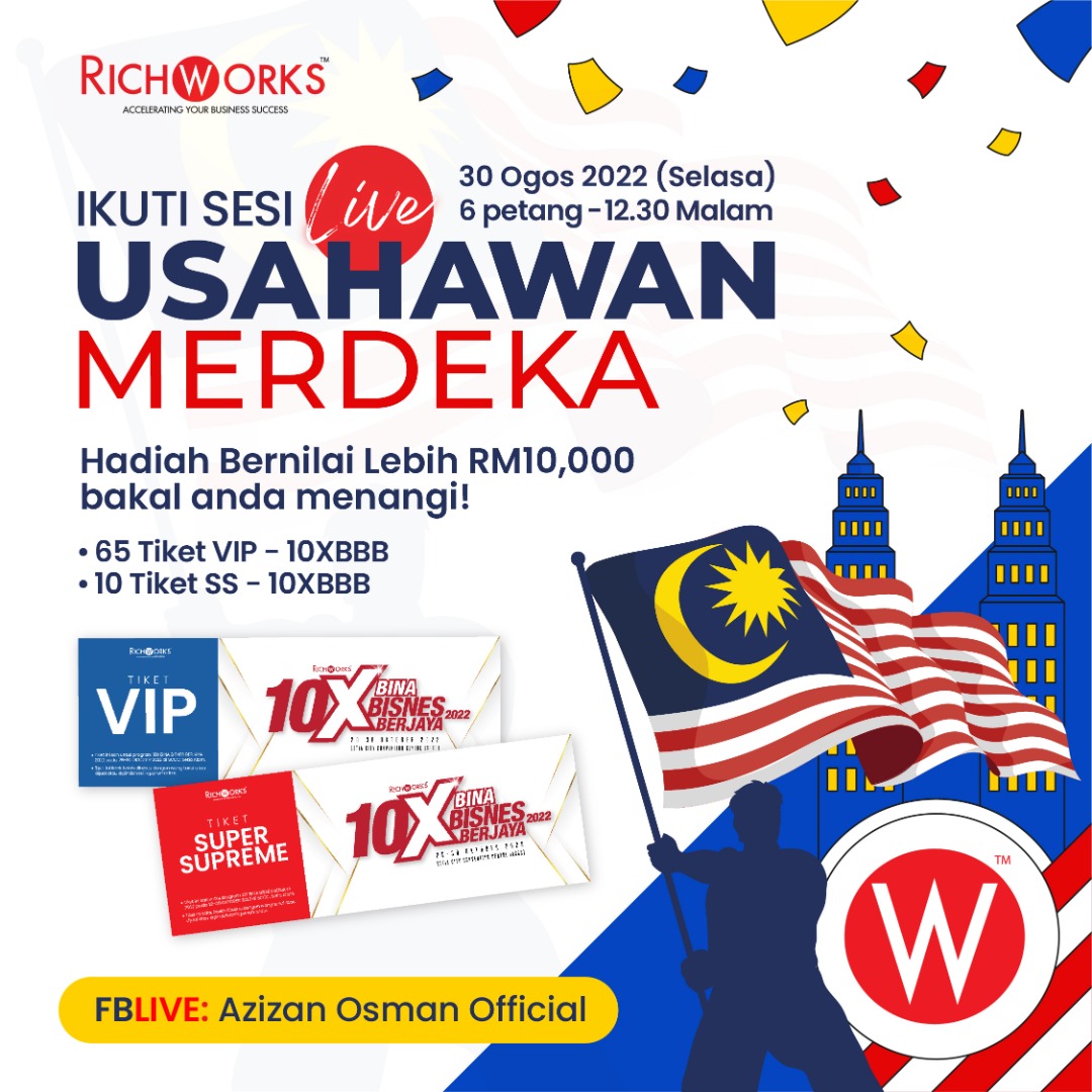 RichWorks hari ini akan mengadakan sambutan Usahawan Merdeka dari pukul 6 petang hingga ke 12.30 tengah malam di platform Facebook : Azizan Osman Official.