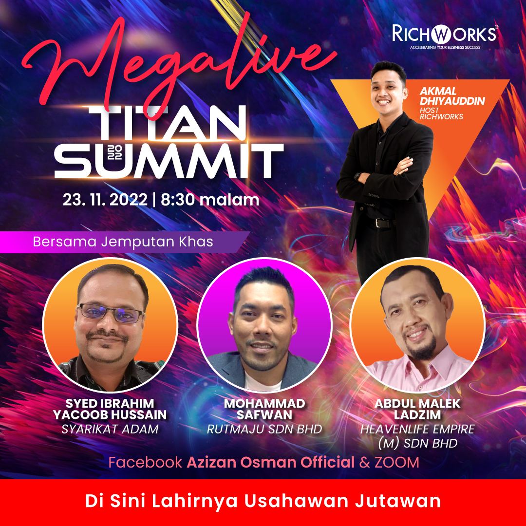 Megalive Titan Summit malam ini kita akan bawakan 3 Jutawan RichWorks Titanium dalam industry peruncitan (retail) untuk kongsikan kisah di sebalik kejayaan mereka.