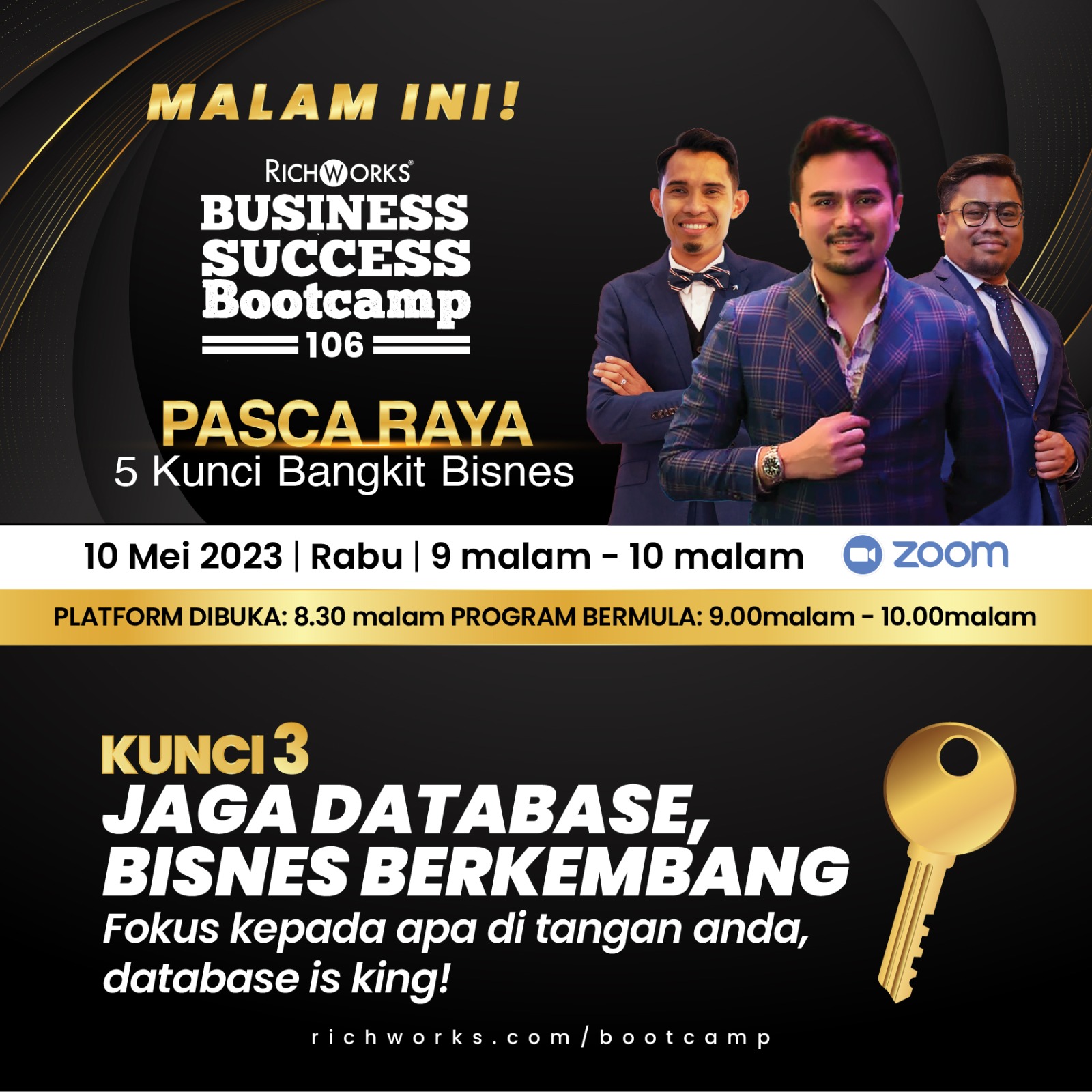 Business Success Bootcamp 106: Pasca Raya malam ini membongkar Kunci 3: Jaga Database, Bisnes Berkembang bersama speaker hebat.