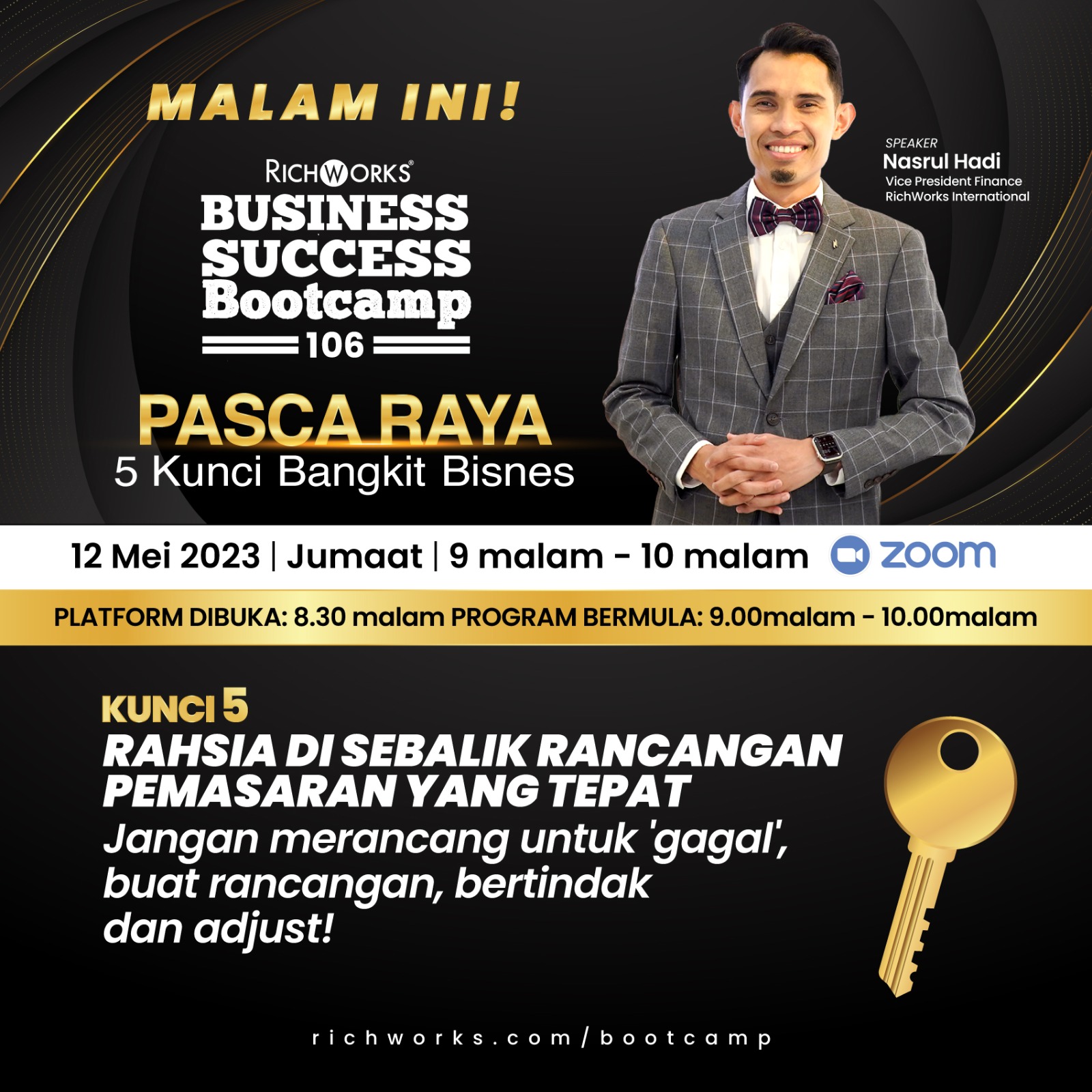 Malam ini, Business Success Bootcamp 106: Pasca Raya akan melabuhkan tirai dengan Kunci 5: Rahsia di Sebalik Rancangan Pemasaran Yang Tepat.