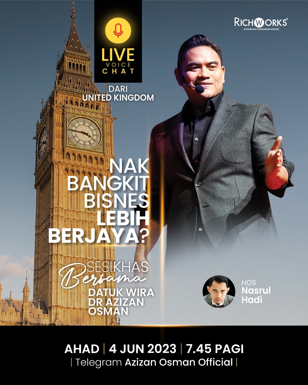 Sesi istimewa live dari United Kingdom di Telegram Azizan Osman Official pada 7.45 pagi (waktu Malaysia), Ahad ini.