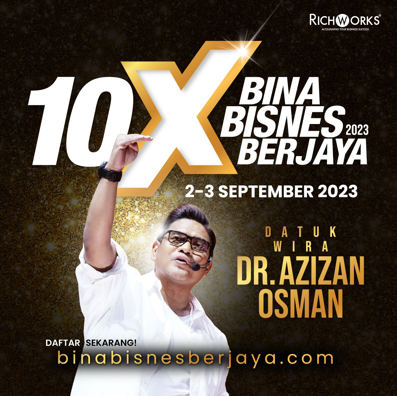 Jangan tunggu lagi untuk sertai program 10x Bina Bisnes Berjaya pada 2 September hingga 3 September 2023, lokasi di Lembah Klang. Program ini sebagai panduan untuk anda kukuhkan bisnes dan capai jualan RM1 juta, RM10 juta bahkan lebih RM100 juta dalam apa jua cabaran.
