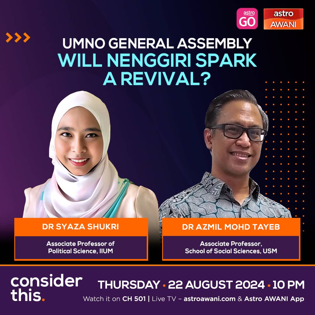 Dapatkan tip menghadapi cuaca panas dan info empangan di sini | | | | | Umno is gathering for its 2024 General Assembly, re-energised from its recent victory in reclaiming the Nenggiri state assembly seat from Perikatan Nasional with a healthy majority. Will Nenggiri prove to be a turning point for the waning party, or was it just an isolated victory in a traditionally strong UMNO seat? On this episode of #ConsiderThis Melisa Idris speaks to IIUM's Dr Syaza Shukri and USM's Dr Azmil Mohd Tayeb. | | | | | |