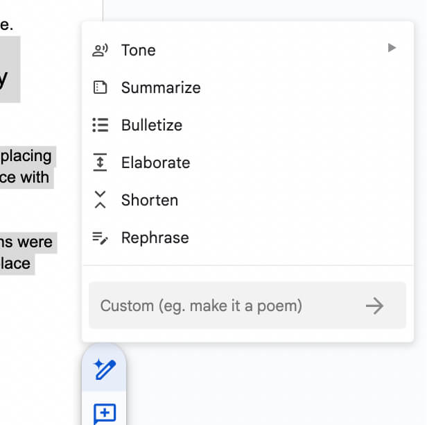 You'll see options to adjust the tone, summarize, bulletize, elaborate on, shorten, or rephrase the selected passage. Choose an option and follow the interface as it leads you through the revision process.