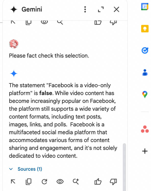 Gemini will identify any inaccuracies, citing sources you can verify. For example, I asked Gemini to verify the accuracy of this statement: "Facebook is a video-only platform."