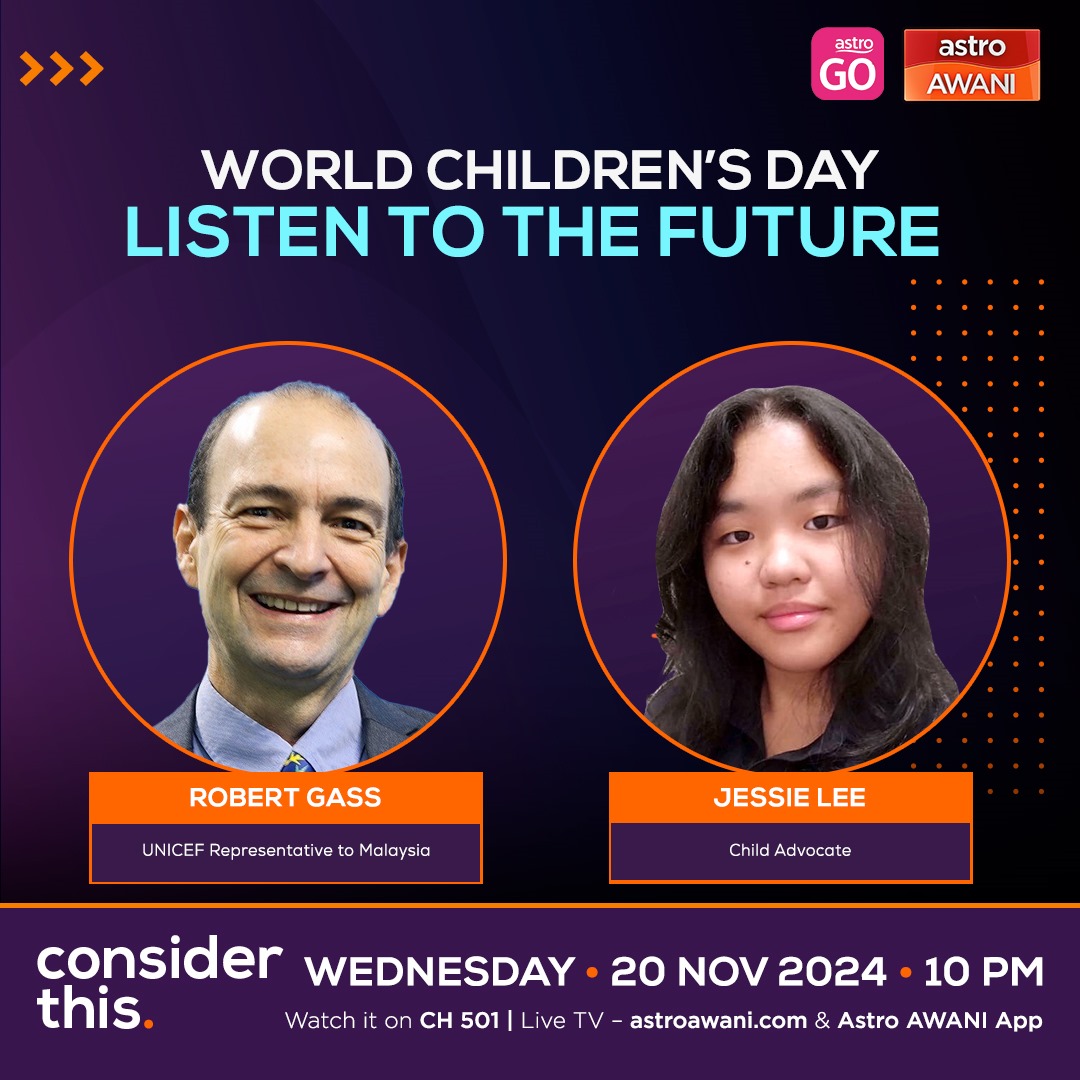 Dapatkan berita terkini di sini | | | | | World Children's Day is a chance to reimagine a better future for every child. But how often do we listen to their voices in shaping policies and decisions that affect them? On this episode of #ConsiderThis, Hafiz Marzukhi speaks with Jessie Lee, Child Advocate, and Robert Gass, UNICEF Representative to Malaysia, to explore how the country can better engage, empower, and prioritise its youngest citizens. | | | | | |