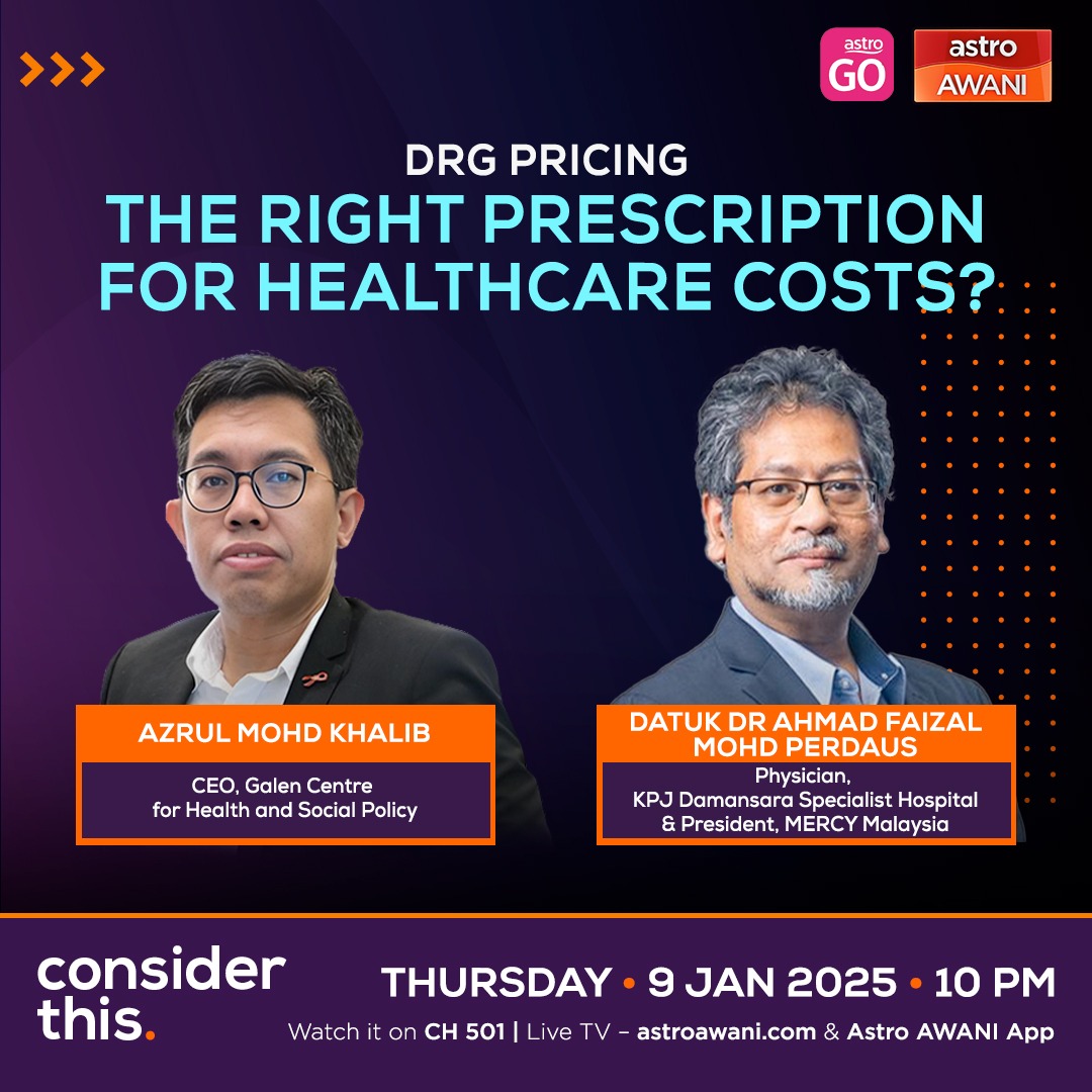 Dapatkan berita terkini di sini | | | | | Medical costs are rising, and so are the premiums for health insurance. To tackle this, the Malaysian government is considering introducing a Diagnosis-Related Group pricing system. But is DRG the right prescription for Malaysia's healthcare woes, or will it create new challenges for hospitals, doctors, and patients alike? On this episode of #ConsiderThis Melisa Idris speaks with Azrul Mohd Khalib of the Galen Centre, and KPJ Damansara Specialist consultant respiratory physician Datuk Dr Ahmad Faizal Mohd Perdaus, who is also the President of MERCY Malaysia. | | | | | |