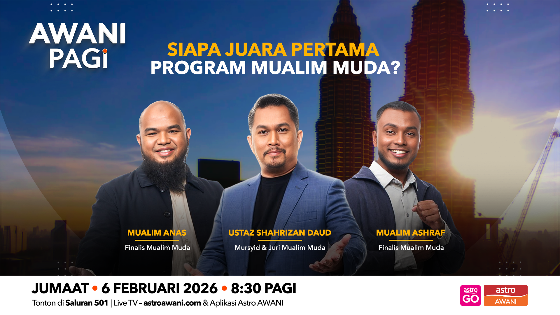 Dapatkan berita terkini WEF di sini | | | | | Bersama dua finalis Mualim Muda, Ashraf dan Anas serta Mudir Mualim Muda, Ustaz Shahrizan Daud menjelang final program realiti Islamik terbitan Astro, Mualim Muda. Jangan ketinggalan, hanya di #AwaniPagi, 8:30 pagi Jumaat. | | | | | |